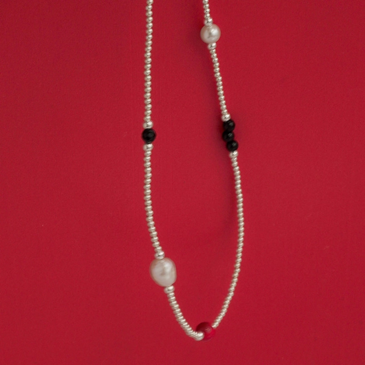 비비드한 붉은 빛의 4mm 산호가 촘촘하게 엮여있어 레이어드로 활용하기에 좋습니다.